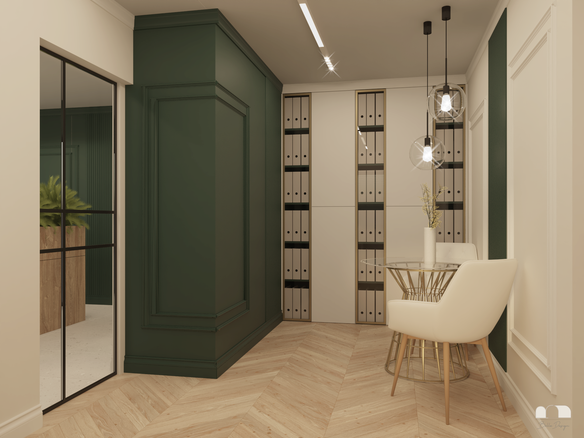 Projekt biura rachunkowego opiera się na eleganckim kontraście butelkowej zieleni i jasnych, białych wnętrz.
