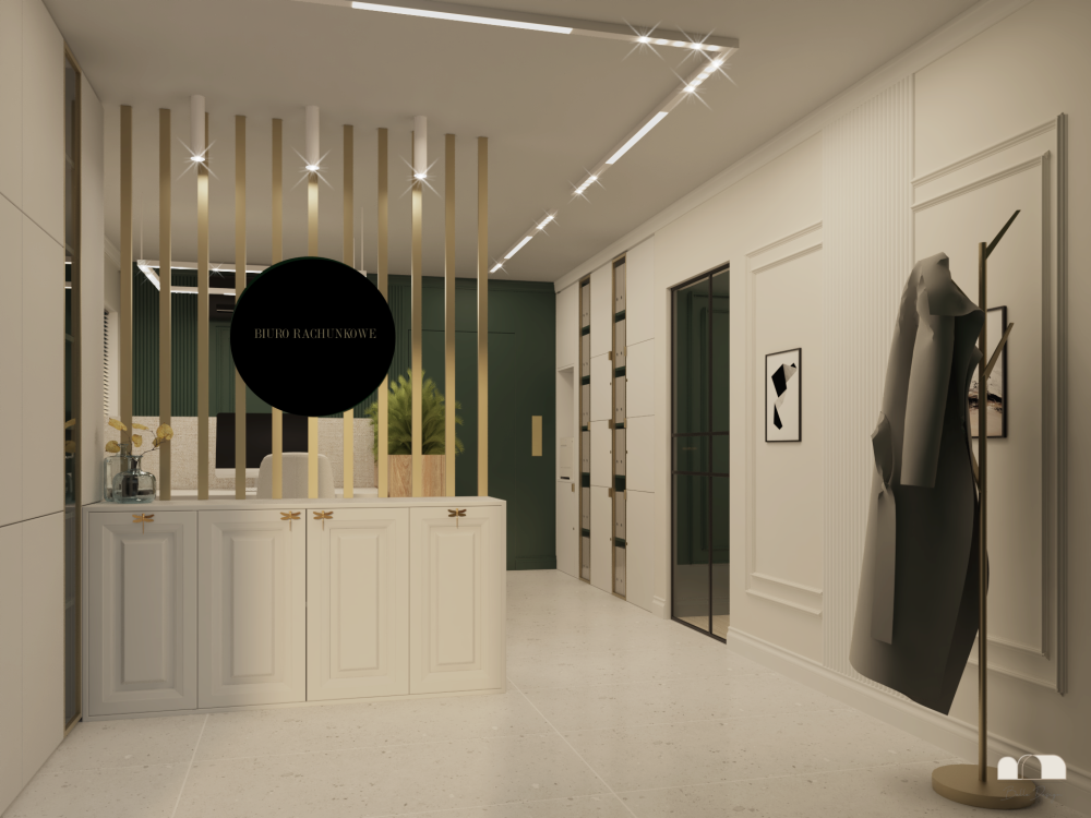Przestrzeń została zaprojektowana tak, by łączyć profesjonalizm z przytulną atmosferą sprzyjającą zaufaniu i koncentracji. Białe tło ścian i mebli podkreśla czystość formy i porządek, a akcenty w głębokiej zieleni – obecne w tapicerowanych elementach, dodatkach czy ścianach akcentowych – wprowadzają spokój, prestiż i wizualną równowagę.