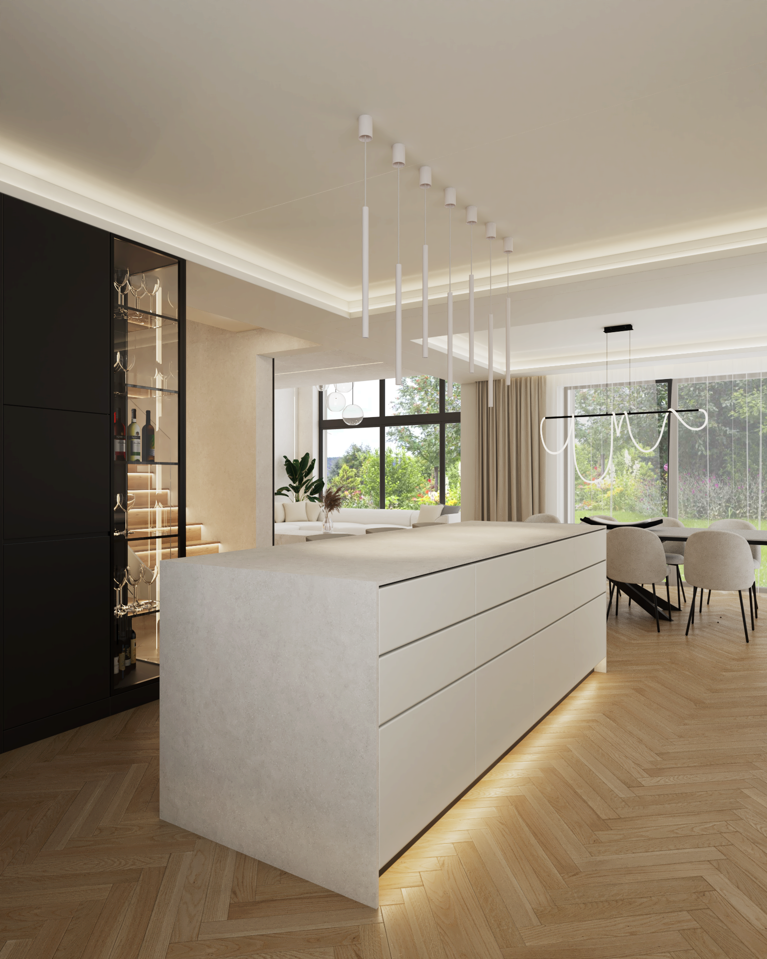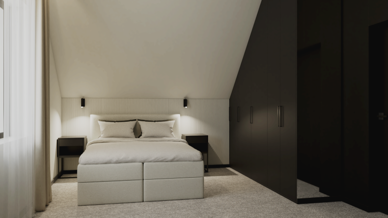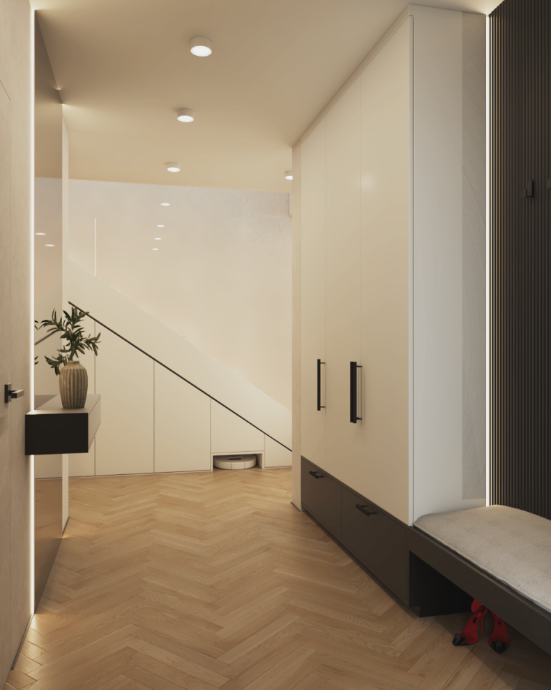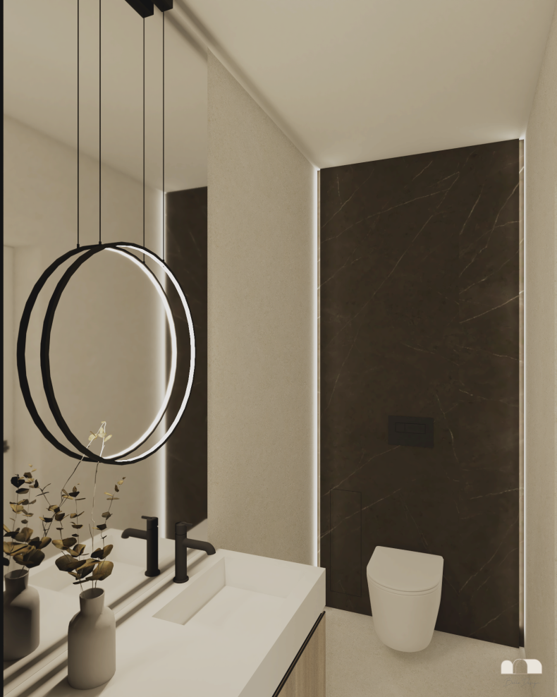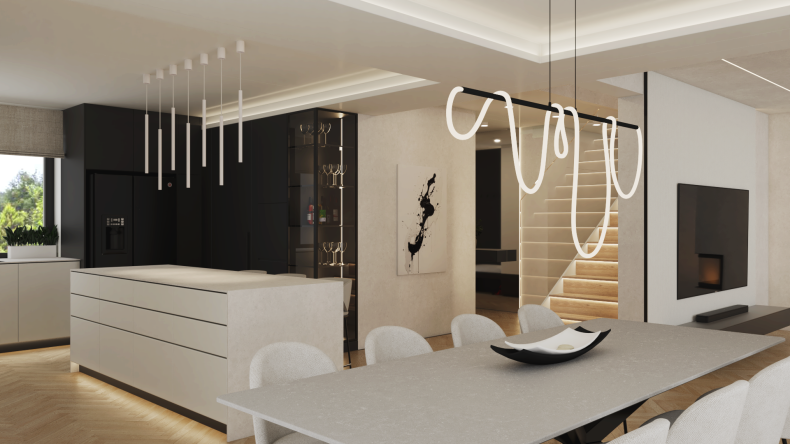 Stworzyliśmy przestrzeń ponadczasową, opartą na stonowanych barwach, eleganckich kontrastach i naturalnych materiałach. Delikatne akcenty ocieplają całość, a światło odgrywa kluczową rolę, budując wyjątkowy klimat i podkreślając charakter wnętrz.