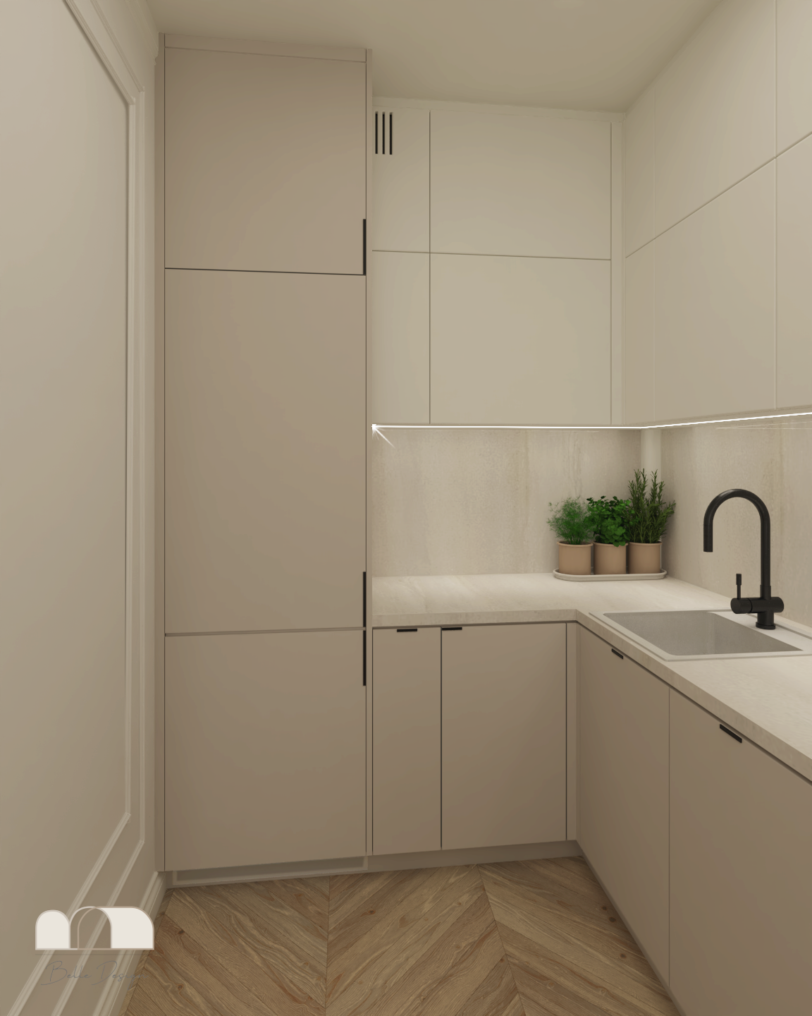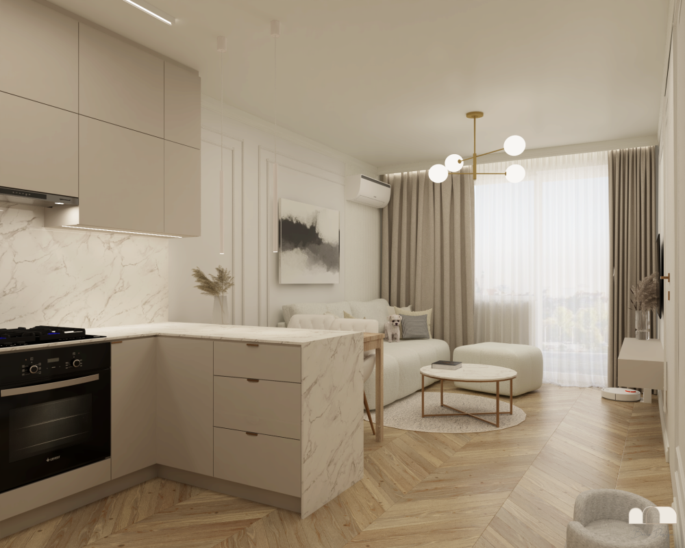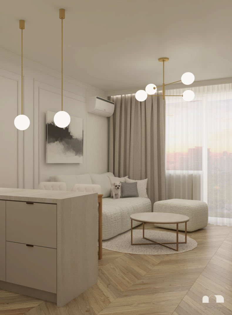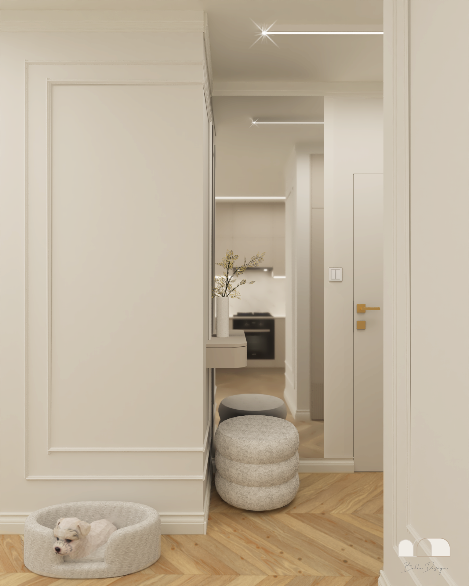 Projekt powstał w mieszkaniu z rynku wtórnego, które zaaranżowaliśmy na nowo z myślą o potrzebach młodej pary i ich energicznego psa – z dbałością o wygodę, trwałość i wyjątkowy klimat. Połączenie subtelnej elegancji z przytulnym minimalizmem.