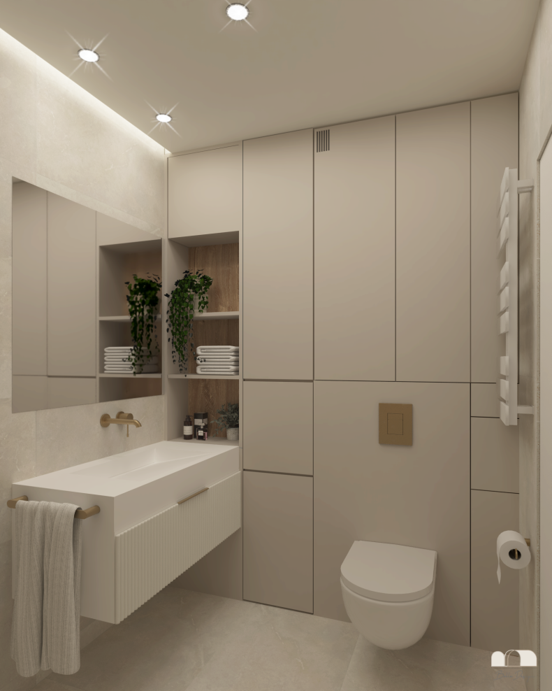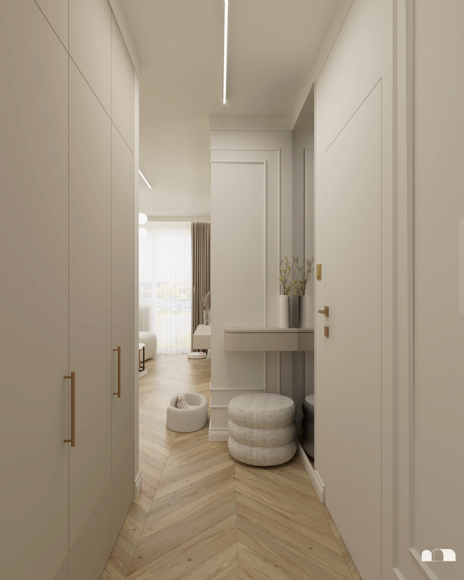 Jasna paleta barw tworzy lekką i spokojną bazę, którą uzupełniają złote detale oraz akcenty czerni – dodające wnętrzu charakteru i szlachetności.